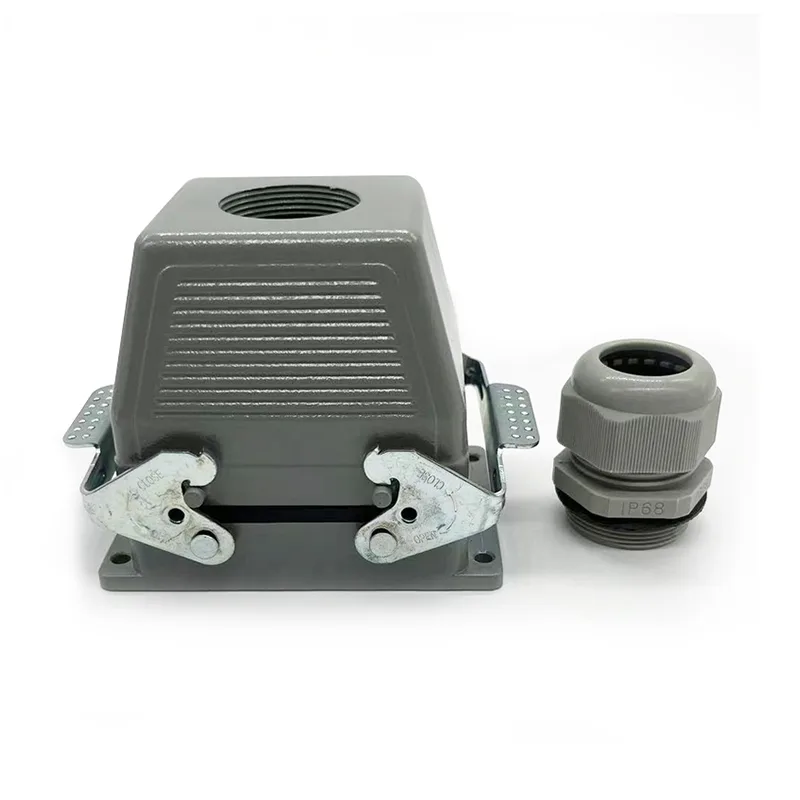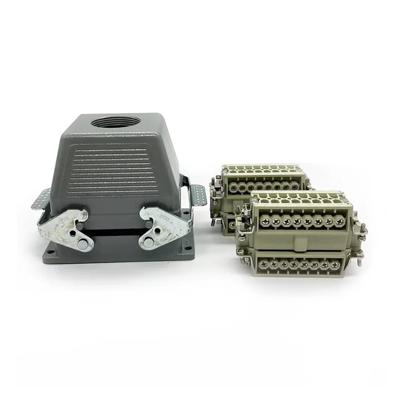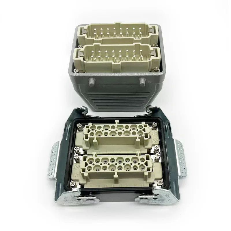 32-контактні з’єднувачі TG Heavy Duty — це зовнішня верхня частина корпусу. З нею слід працювати як з вставними деталями, так і з внутрішніми. Зазвичай він фіксується за допомогою двох частин HE-016-M, але деякі особливі клієнти хочуть зібрати з двох частин HE-016-F. Це також корпус для HSB-016. Завдяки водонепроникності IP65 його можна використовувати на вулиці. 32-контактні з’єднувачі TG Heavy Duty відповідають PG29. Якщо клієнти мають інші запити на розмір кабельного вводу, ми можемо прийняти та замовити виробництво.