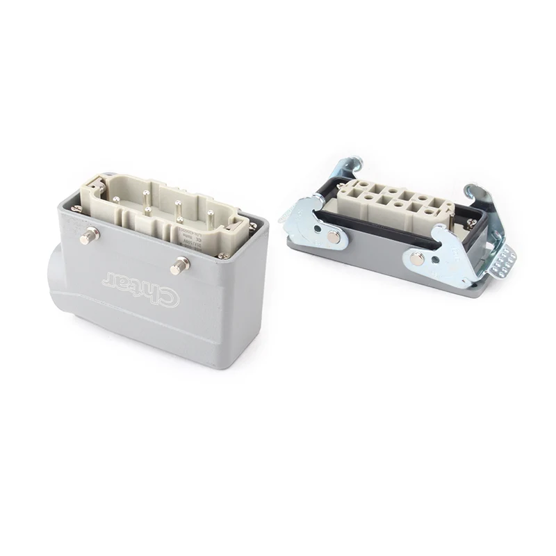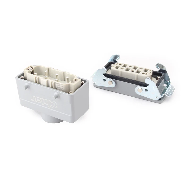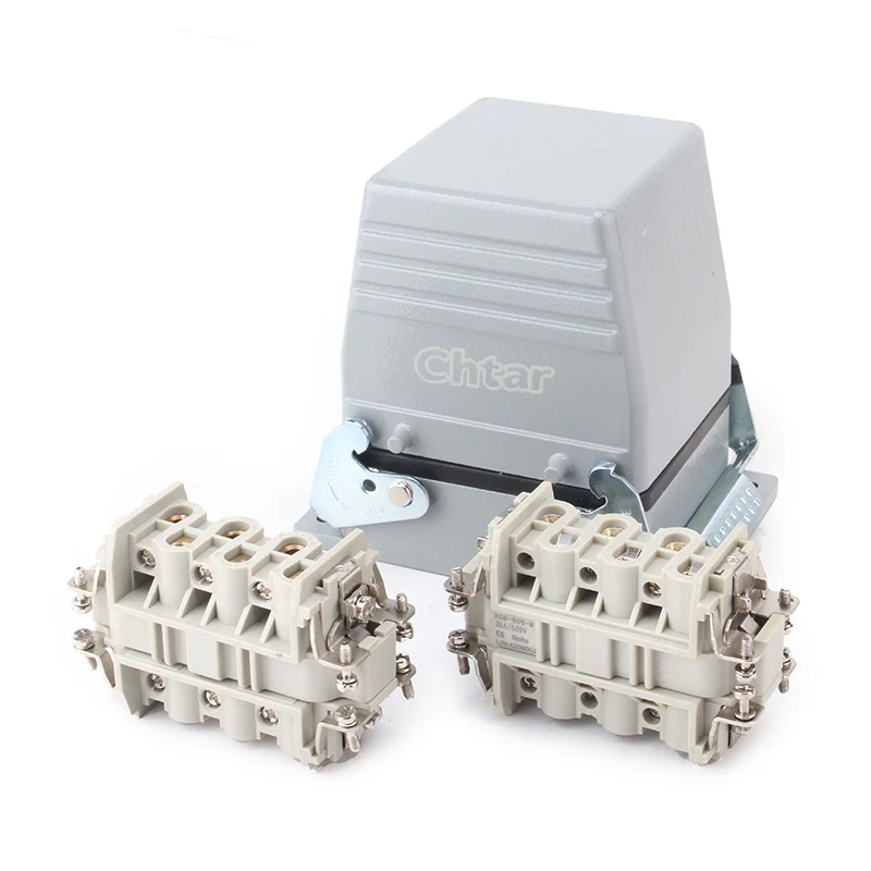 35A 6 Pin Insert Heavy Duty Connector — оброблений алюмінієвий корпус H16B для важкого роз’єму. Він виготовлений із міцного матеріалу PC і посрібленої латуні. Латунні шпильки CHTAR покриті сріблом, що забезпечує хорошу якість і кращу електропровідність. Він містить ущільнювальну гуму, що робить його водонепроникним.