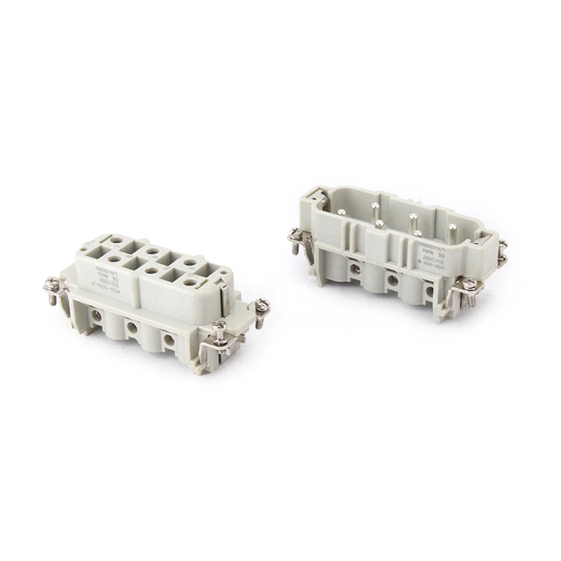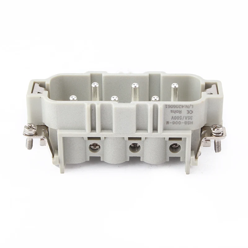 HSB-006-M Роз’єми для важких умов роботи HSB працюють під струмом 35 А. 6-контактний роз’єм для важких умов із вставкою має 6 або подвійні 12 контактів для контакту з проводами. Він пропонується для різних умов роботи та популярний у автоматичній промисловості та видах з’єднання електропроводки машин.