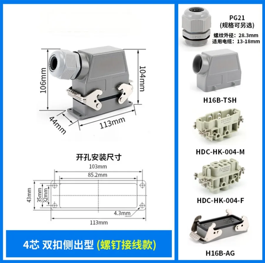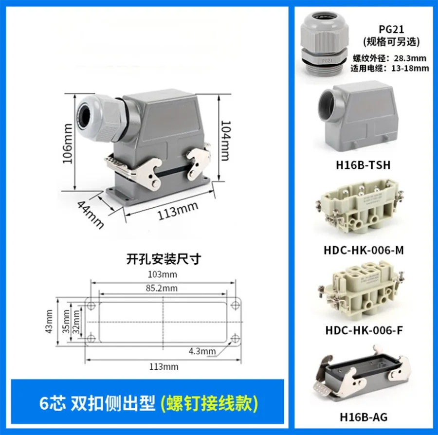 80A 4+2 Pin Insert Heavy Duty Connector — оброблений алюмінієвий корпус H16B-TSH роз’єму важких умов. Він виготовлений із міцного матеріалу PC і посрібленої латуні. Латунні шпильки CHTAR покриті сріблом, що забезпечує хорошу якість і кращу електропровідність. Він містить ущільнювальну гуму, що робить його водонепроникним.