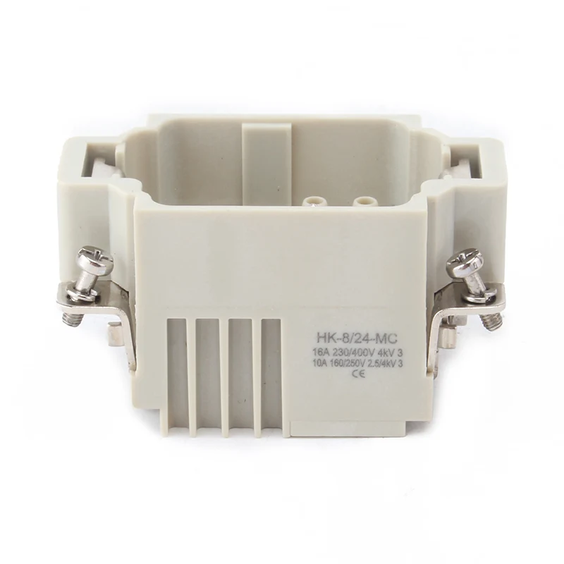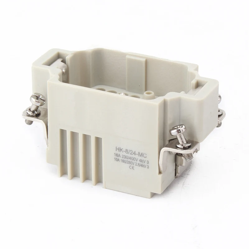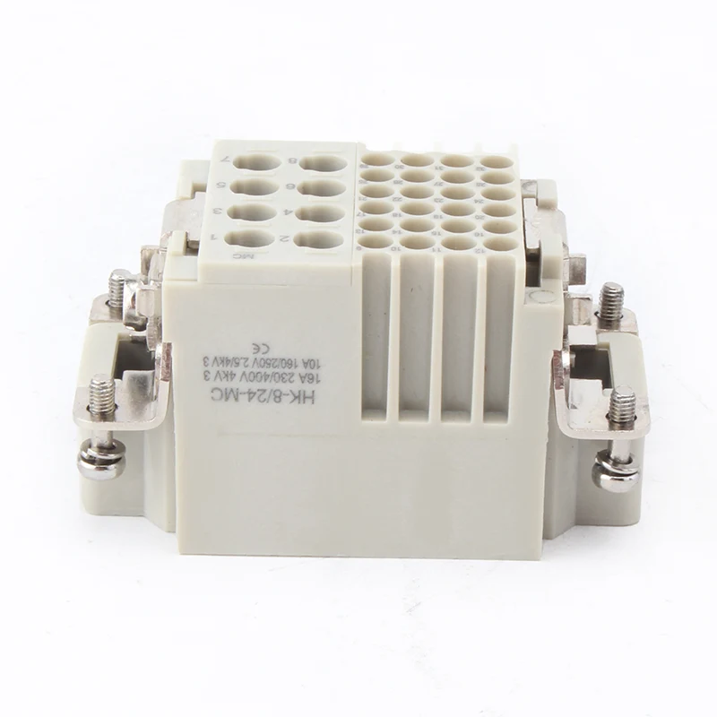 80A 4-контактний вставний з’єднувач для важких навантажень – це застосування для сильного струму 80A. Він підтримує конфігурацію джерела живлення 4+PE (включаючи захисне заземлення). Він вологостійкий, вогнестійкий (UL94 V-0). Це також ступінь IP65. Він сумісний з корпусами 16B і має модульну конструкцію для легкого розширення. Його також можна зібрати як 4-контактний плюс 2-контактний. Вони виготовлені з ПК і латунних штифтів.