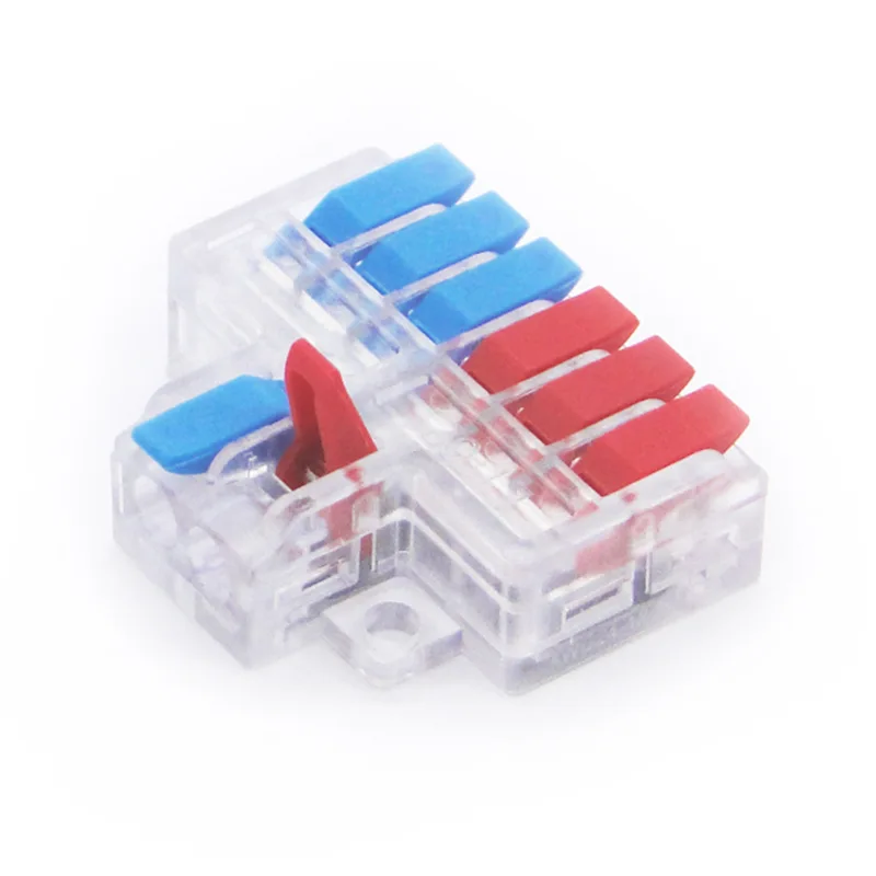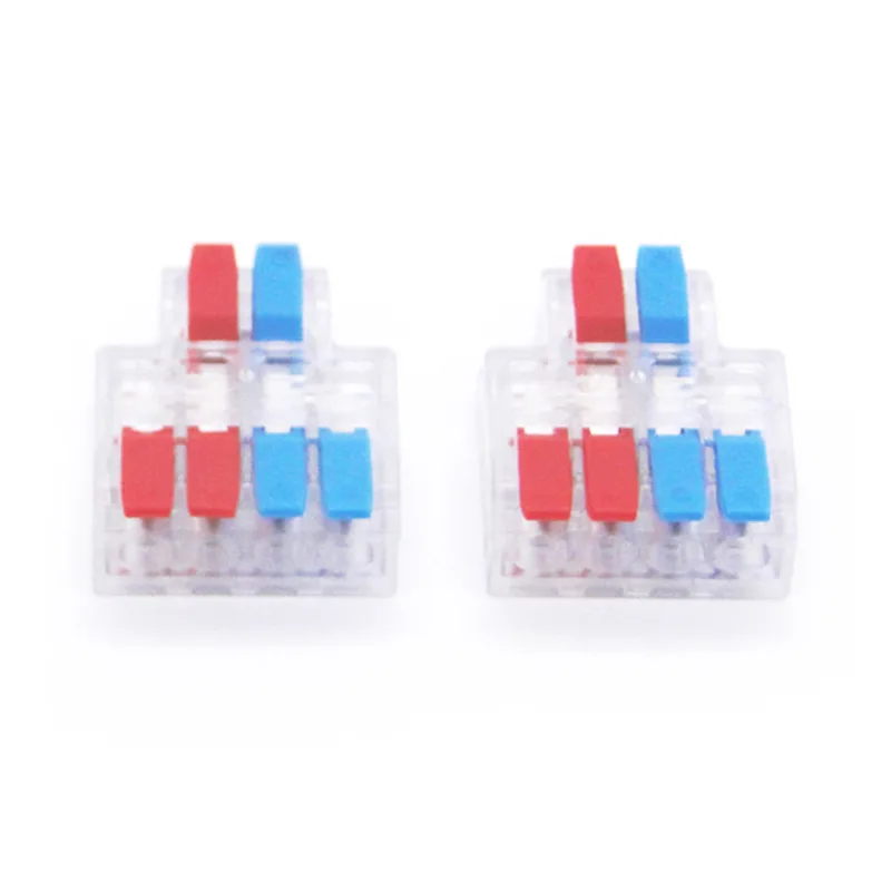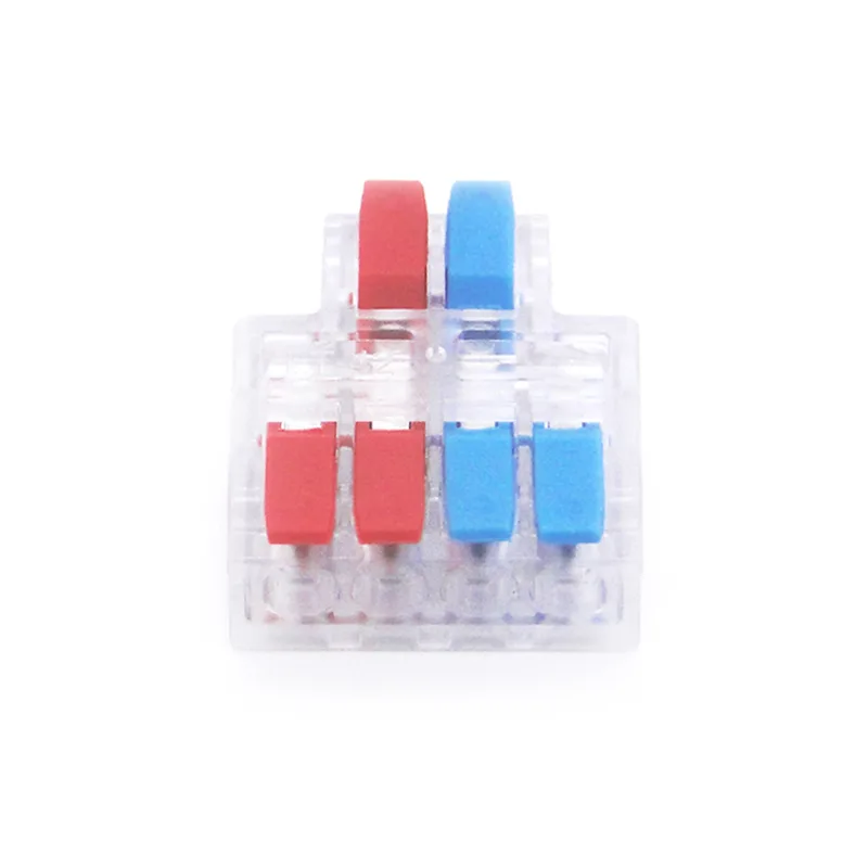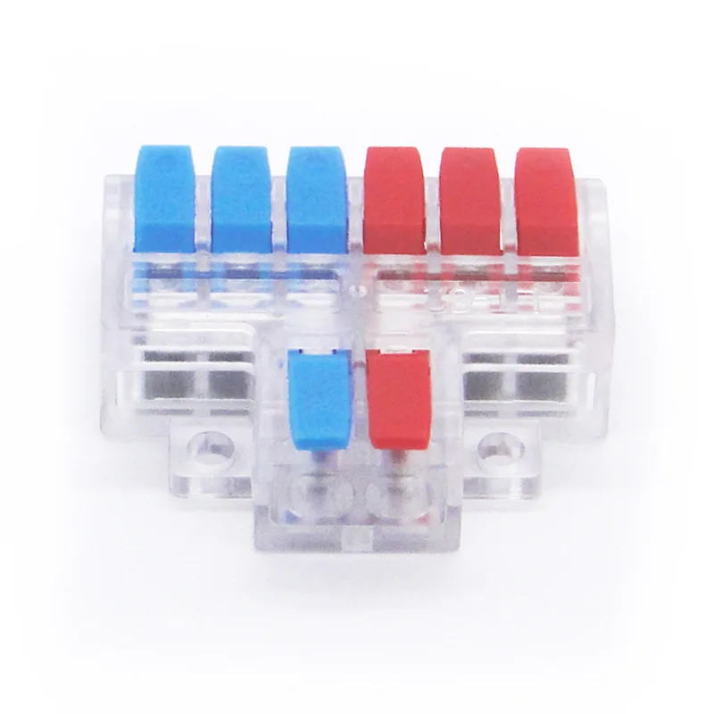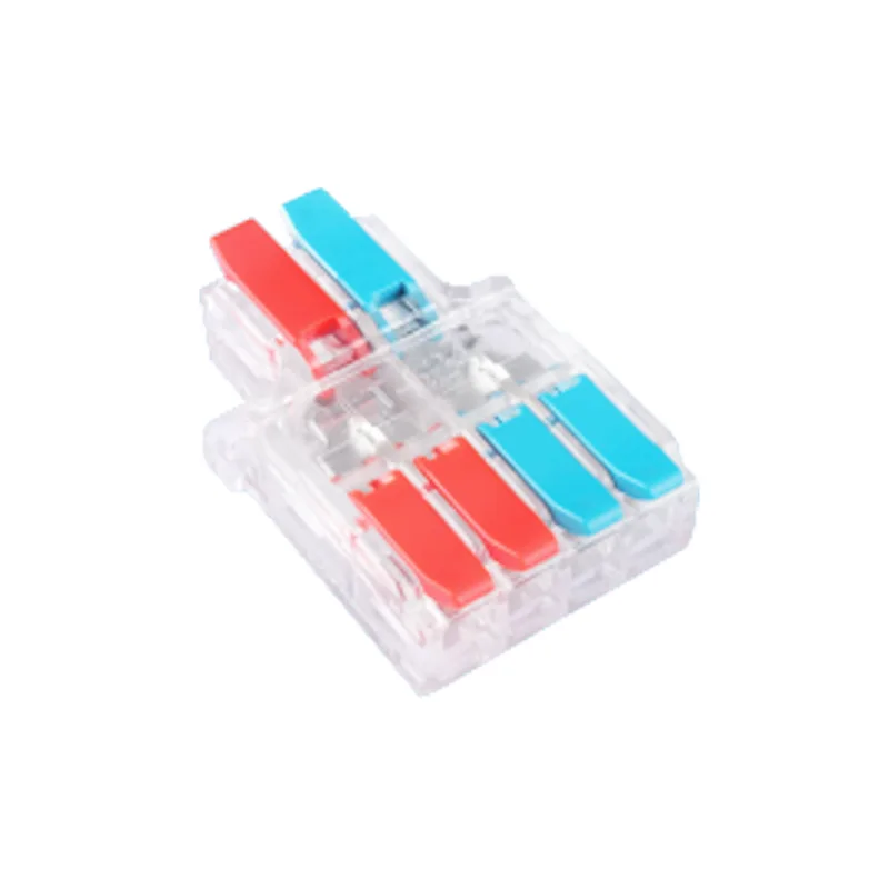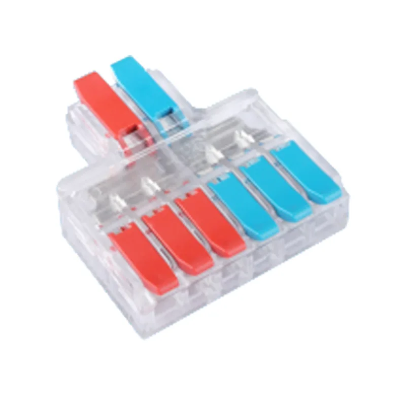 Швидкі з’єднувачі для з’єднувальних дротів «два входи і чотири виходи» призначені для кабелів великого калібру, підтримуючи з’єднання до 6 квадратних міліметрів. Витримує струм до 35 ампер. Вони використовують ручки різних кольорів, щоб чітко розрізняти маршрути проводки.